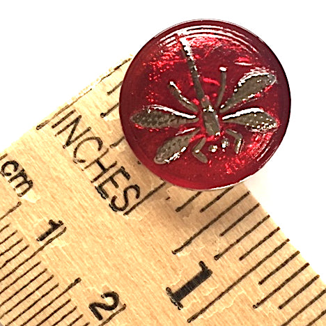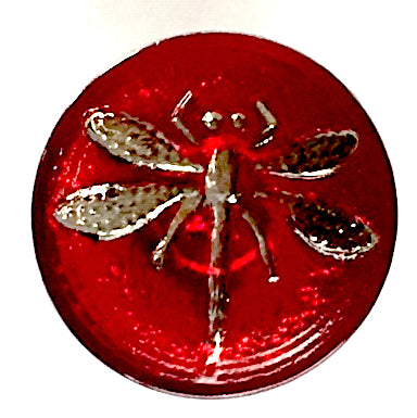 Glowing, vibrant dark red glass seems self-illuminated. Silver dragonfly. Almost 3/4" diameter and about 1/4" deep with the shank. Shank opening around 2.25mm. Most of our Czech glass buttons flash different colors but this one is red, red and more red, true, deep, cranberry-not-orange, red. Finest quality artisan Czech glass button. Sold per button.