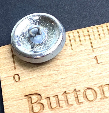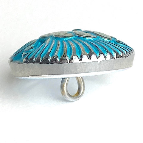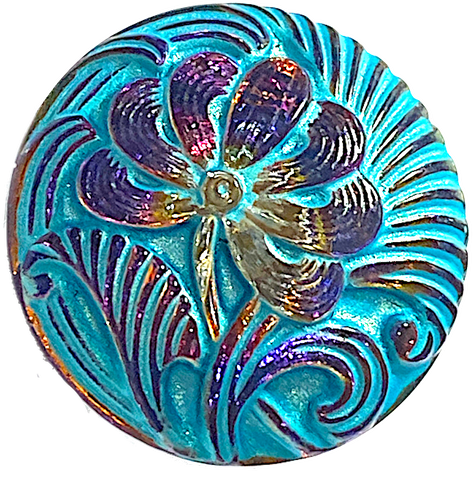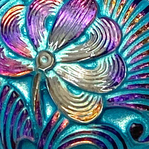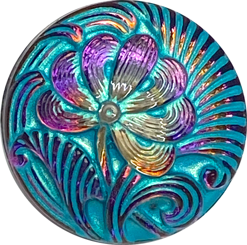 Purples, reds, coppers, blue-violets, magentas, with a turquoise wash on this stunning Czech Glass button. The matte blue background stays the same; the colors in the flower change in the light. 18mm or almost 3/4" diameter and about 1/4" thick including the metal shank. Shank opening around 2mm. Sold per button
