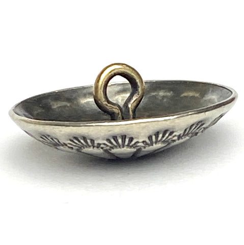 German nickel silver 16-petaled flower button is 13/16" in diameter, with a bit of shine. Shank loop back with an opening around 2.25mm. It is domed, and about 1/4" thick including the shank. To us, the thicker black lines give it a somewhat rustic look. USA.