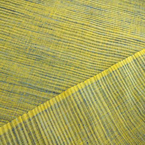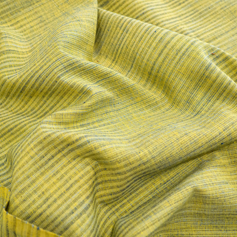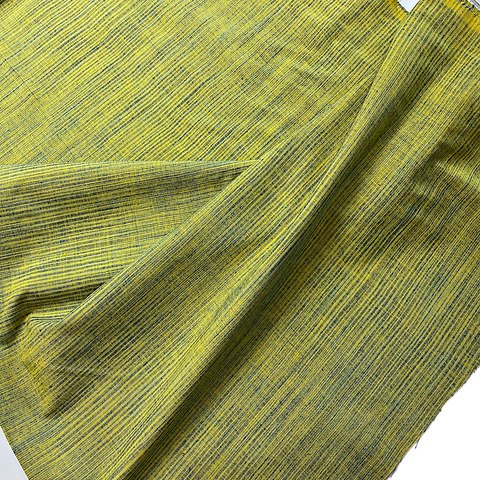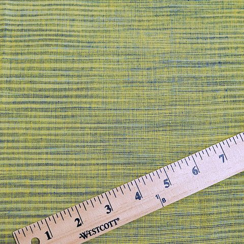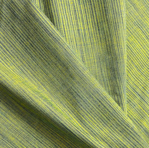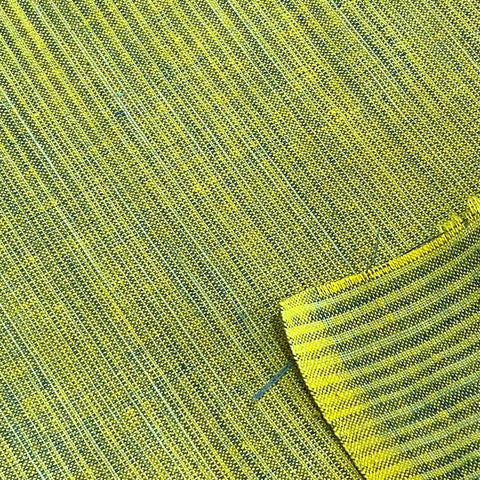 Crosswise yarn-dyed abstract in bright yellow and several blues create an overall bright golden lime effect. The weave is random and rustic. In some areas the stripes are strong and clear, in other areas they almost disappear, with the lime color forming blurry abstract shapes. The two or three colors of blue fibers create the sometimes- stripes, when woven onto the yellow warp. Rustic 100% cotton, same front and back, with the woven effects changing constantly. Soft, fairly smooth with a few slubs. Great for shirts, tops, dresses, tunics, shorts, pants, vests. Vendor says to hand wash separately cold, no bleach, line dry, cool iron. 100% Cotton from India.
