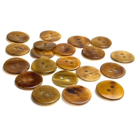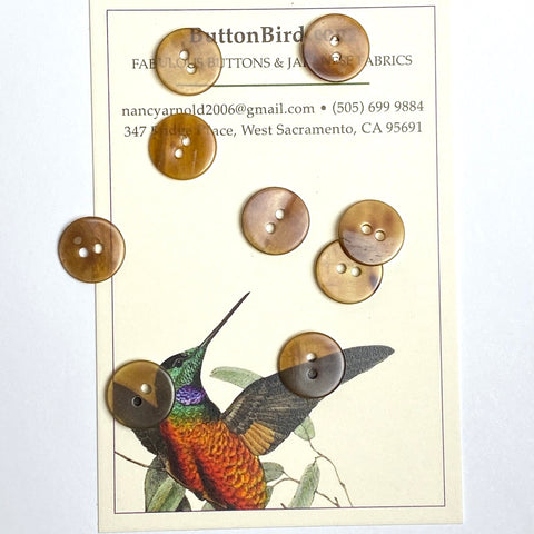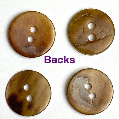 Gorgeous brown tones with lots of natural variance and a bit of translucence, these came from Japan. We think this is their natural color, and almost all are somewhat clear, some more than others. 1/2" or slightly larger, 14mm, with 2 holes. These buttons are thin and strong, sleek and smooth with medium shine. Backs aren't as smooth. You'll receive 18 buttons for $7.50.