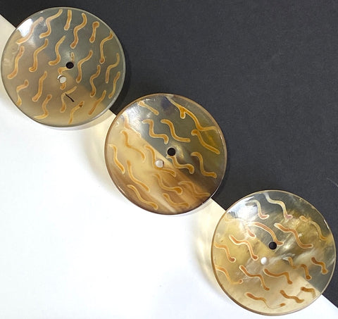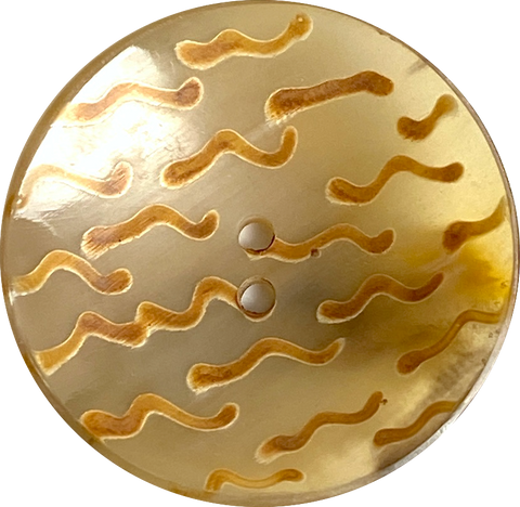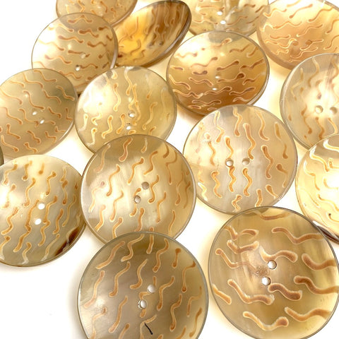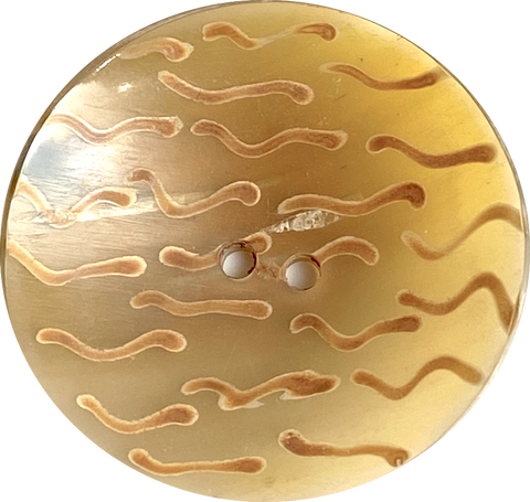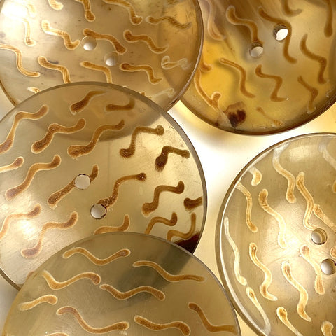 Almost 2" in diameter, unique button made from soft gold-toned, glowing, somewhat see-through water buffalo horn. The coloration of each one is naturally unique, and the squiggly 'birds' vary from button to button also, of course. (Lots of time went into making each one individually.) Sleek and smooth, with sheen and translucence. They're very durable and may be machine washed and dried. 15/16" diameter, and about 1/2" deep from the side. Holes are around 3mm. Sold per button. No two alike.