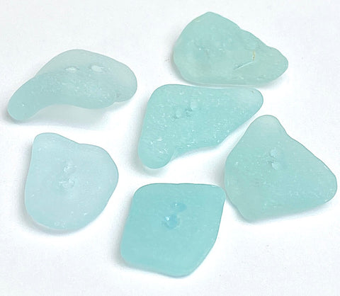 Tumbled for years in the ocean, sea glass discovered on the beach and made into buttons. Soft edges, different natural shapes and sizes, translucent, smooth, with frosty patinas from sea water, waves and friction. Two holes about 1.5mm. You'll receive the exact six buttons shown. The last photo shows the other side. Found and drilled in the US.