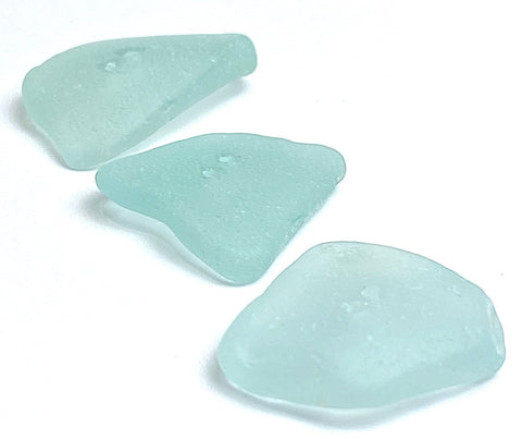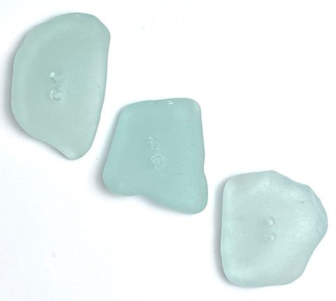 Tumbled for years in the ocean, sea glass discovered on the beach and made into buttons. Soft edges, different natural shapes and sizes, translucent, smooth, with frosty patinas from sea water, waves and friction. Two holes about 1.5mm. You'll receive the exact three buttons shown. They're a bit larger than most we have. The last photo shows the other side. Found and drilled in the US.