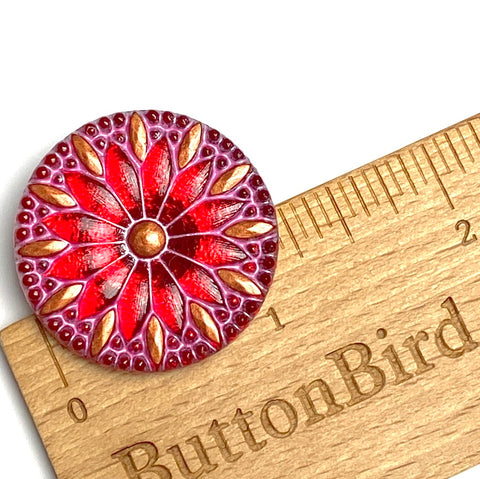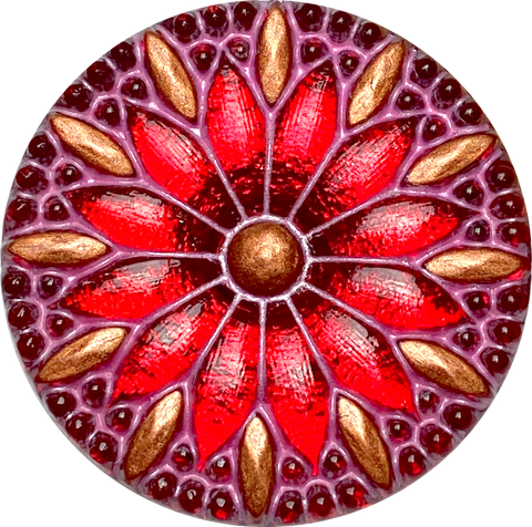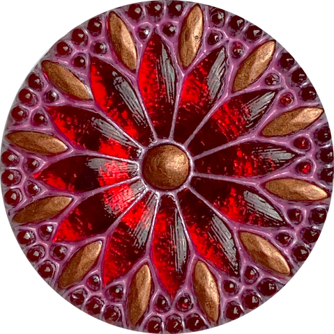Sparkling ruby petals are translucent and iridescent; they are constantly changing color, depth, shine and opacity and can look solid, almost matte burgundy. And everything in between. The other elements' colors, dusty rose outlining, pastel copper accents and raspberry tiny round spots, seem to be more stable. This highly iridescent Czech Glass button was made by hand using the old, difficult, traditional techniques that many Czech artisans are famous for.  1-3/16" to 1-1/4" diameter and about 1/4" thick. Four tiny holes on the back. Sold per button.