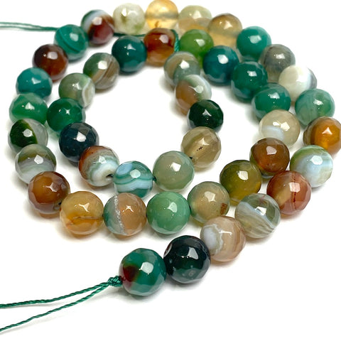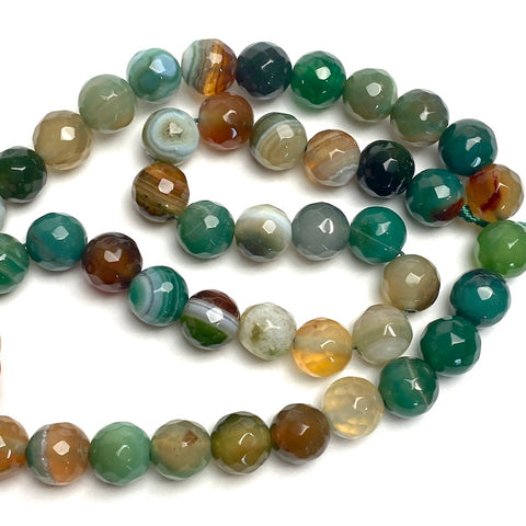 A mix of natural and dyed agates with an abundance of greens. Round and slightly faceted, glistening gemstone in exceptional colors that feel alive. 8mm, with small hole around 1.25mm. You'll get approximately 45 beads on a strand about 14.5" long. You'll get the exact strand shown in the first 5 photos.