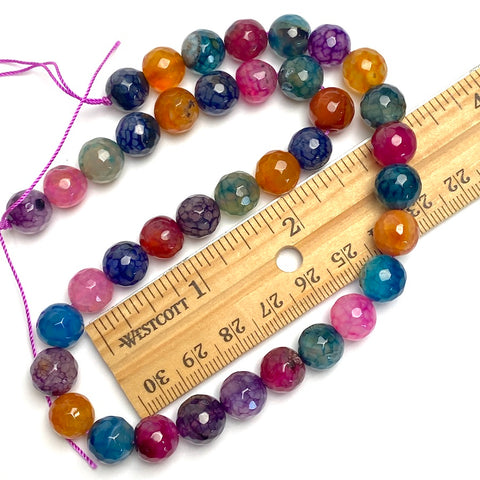 Agates with many rich colors, round and faceted, dyed and natural, glistening gemstone, some with mottles of other shiny shades. Some of the purples are nearly black. 10mm, with small hole around 1.25mm. You'll get approximately 38 beads on a strand about 15" long. Agate.