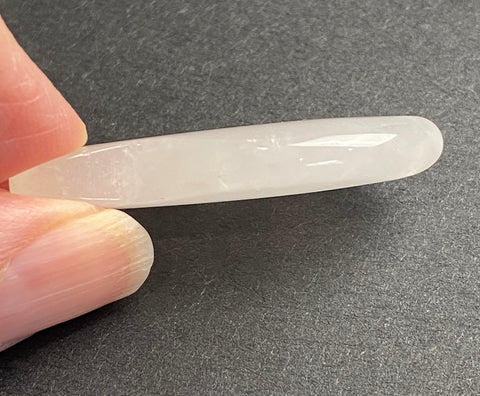Polished, smooth pale pink/pinkish white Rose Quartz fish pendant with 2mm hole. All have natural stone patterns and are almost translucent, which shows up more against darker colors. 1/4" thick, smooth and cool. $5.00 each
