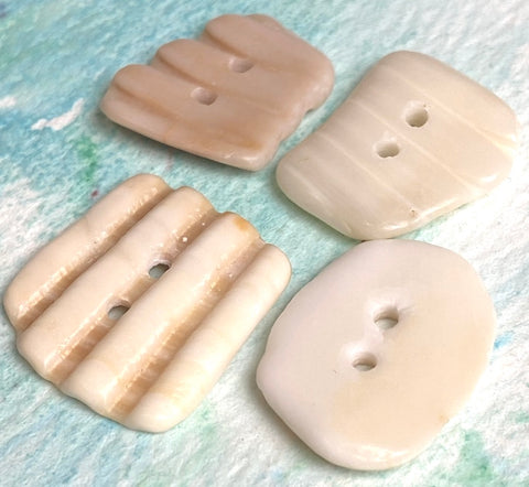 Tumbled beach shells with soft edges, natural shapes, opaque, smooth. Two holes about 2mm. You'll receive the exact four buttons shown; they were gathered on the USA's East Coast, and drilled by hand.