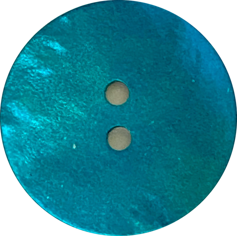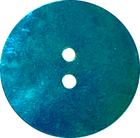 Beautiful, high quality, shiny dyed Mother Of Pearl shell button, in rich, bright, saturated dark teal/turquoise/peacock blue. The shell's natural glow comes through the color, and creates a strong sheen and iridescence. The backs are mottled gray-brown natural shell, shown in the photo with the ruler. Satiny, glowing, thin, natural with lots of variance, for your best uses. Diameter: 18mm / 11/16"; just shy of 3/4". Holes are 1.75mm. Sold per button.