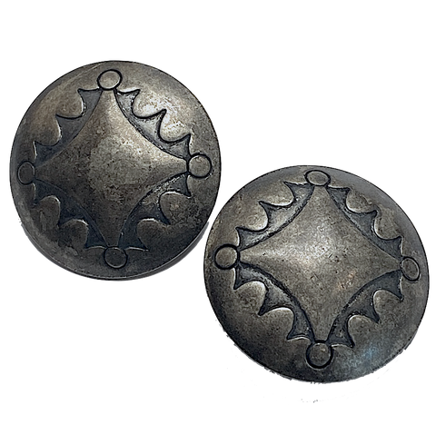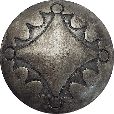 1-1/4" diameter, shank back concho button, Four Directions design, dark, mottled, rustic antique-look brass that has turned dark warm gray and black. Traditional concho design made in Colorado, USA. Shank loop has an opening of about 2.25mm.  Sold per button.  No more after this.