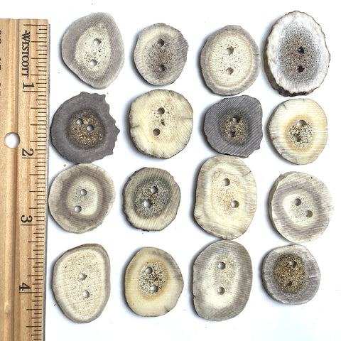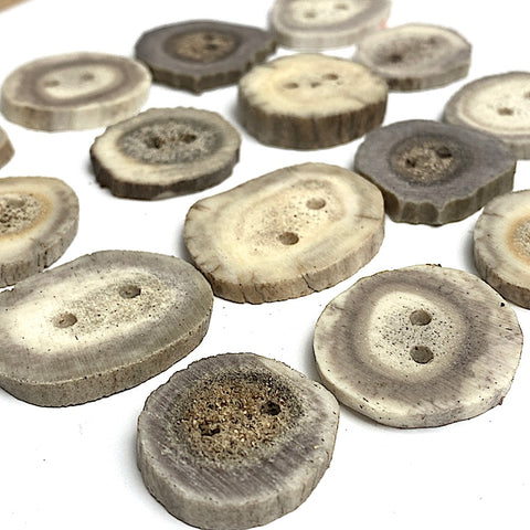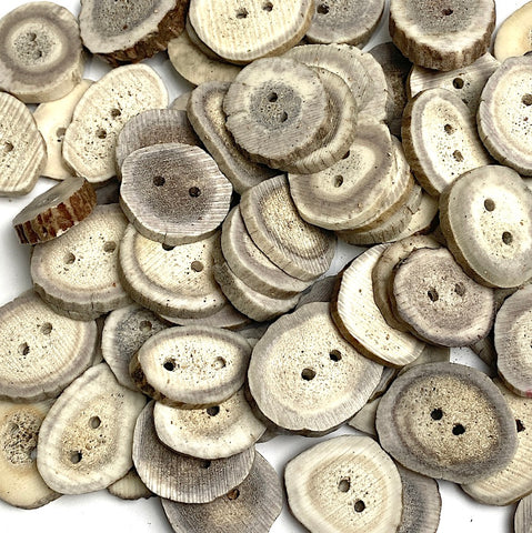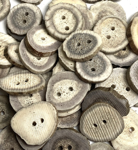 One of a kind buttons with lots of wild variance, made from naturally-shed deer and elk antlers gathered from the ground in the Rocky Mountains, cross-cut and made into buttons by hand one by one. Most are about 1-1/4" but a few are a bit larger or smaller. Natural and imperfect; no two are alike. Lots of personality. Sold per button.