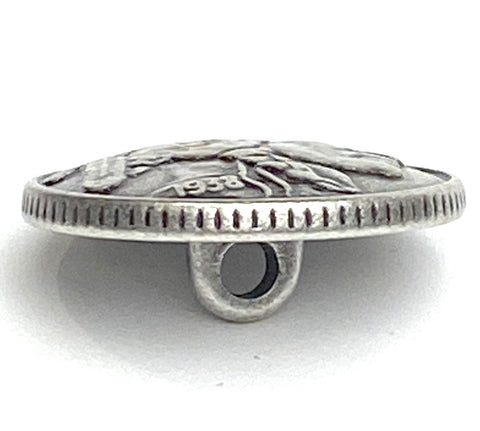 Replica five cent coin, in semi-shiny finish silver color and the same size as an authentic one. Shank opening is about 2.5mm. Lead-free zinc alloy, not USA Made, each one just the same. Sold per pack of SIX Buttons.