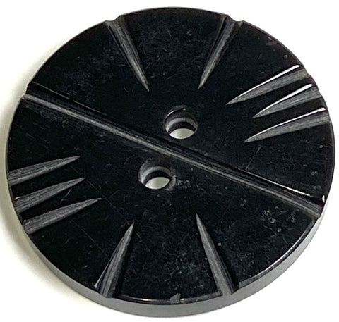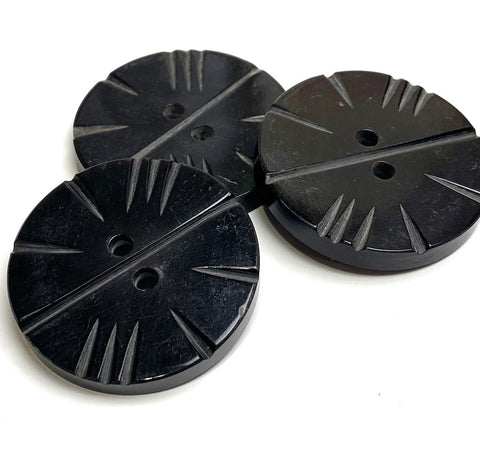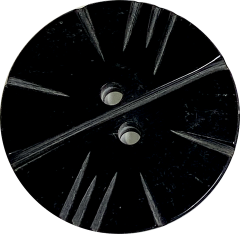 Flat disk, smooth black button hand-carved from water buffalo horn. Eleven recessed lines / slashes are gray. Dynamic, strong but light, satin sheen. Shape and size are quite consistent button to button. The slashes may vary a bit since they're done by hand one at a time by button artisans. Backs are solid black. This is the smaller size, 1.5" diameter, about 3/16" thick, with hole size about 3.5mm. India. This size is not quite as solid, rich black as the larger size. They're pretty good but may have areas of lighter black as you can see.  Sold per button.