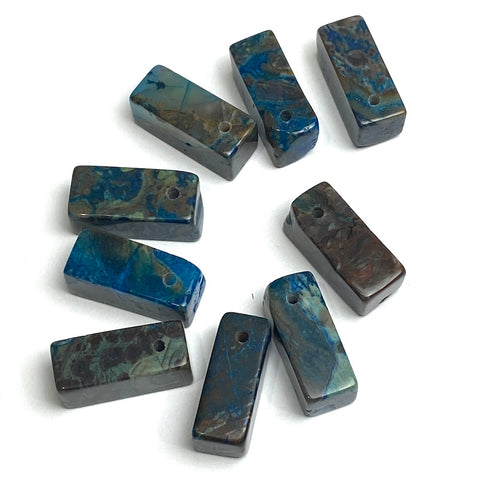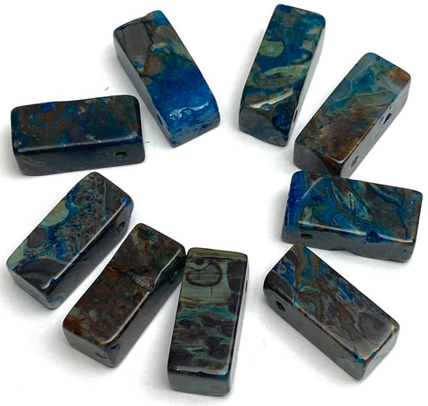 Natural Ocean Agate - a unique type of Jasper stone from the coast of Madagascar. Midnight dark blue blending to nearly black or sometimes almost cobalt in places, dark greens, chocolate, ...all dark tones. 22mm x 9-10mm, so about 7/8" x 3/8" x 3/8". Sleek and smooth with a 2mm hole near one end. No two will match and there are a few rustic features as you can see in the photos; they are real stone: natural, dyed Ocean Jasper which is sometimes called Ocean Agate. They are large beads, solid stone, and ten of them weigh almost 2 ounces. Made by hand, most aren't perfectly shaped, as you can see.