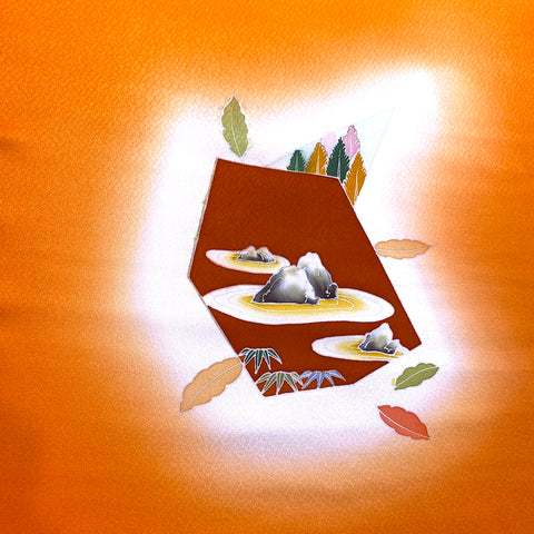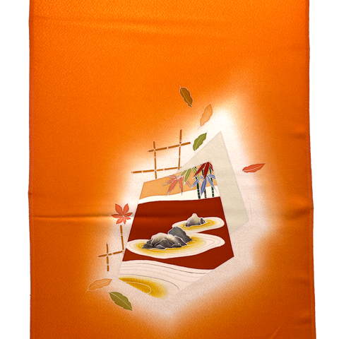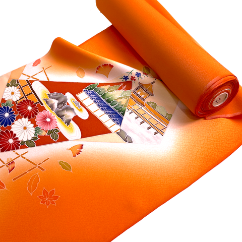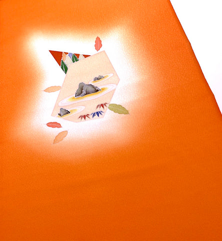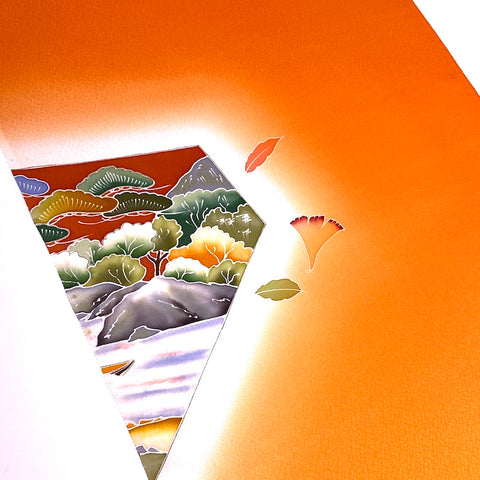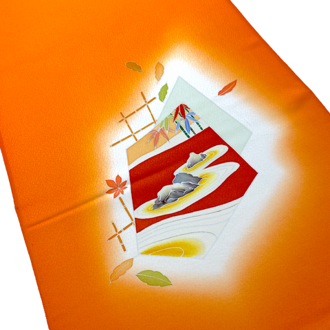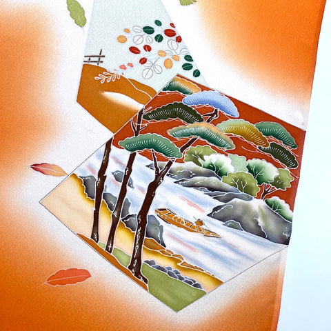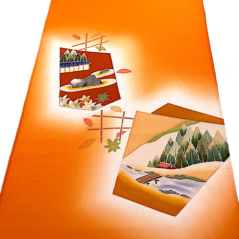 Liquid drape glowing tangerine orange crepe. The designed areas have various sized hand painted natural beauty: forests, flowers, mountains, bamboo, rocks, streams, maple leaves, etc. It was designed and created specifically so that the kimono would be dynamic when worn, showcasing the artwork beautifully in certain areas on the kimono with solid tangerine crepe silk in between. There are 9 designed areas, in various sizes from about 8" x 8", up to the entire 14" width and 31" high. They are spaced from less than a yard apart to a few yards apart, with solid tangerine in between. No two of them are the same but they all coordinate. Liquid drape crepe has a beautiful texture, hand, color and drape. To us, on our computer, the tangerine color in reality is cleaner, not at all towards rust, a bit more towards coral than the photos, better with the other colors. Pure silk, light, flowy, very supple and drapey. 14" wide and about 14.3 yards long and in beautiful condition. You'll get the whole bolt. We've photographed each designed area for you. . Our vendor in Japan calls this bolt "Famous Places Near Kyoto". 100% Silk. Japan.