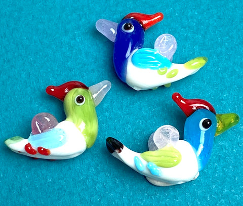 Whimsical, colorful, smooth, shiny, opaque, bright glass bird beads.  No two will exactly match; they're made by hand and each has its own personality as you can see. They can sit fairly securely on a flat surface or be strung, and they face either way. The hole is about 1.25mm.  They're about 1-1/8" or 28mm across, and from tummy to top of head about 3/4"/19mm. Even better in person. Sold per bead.
