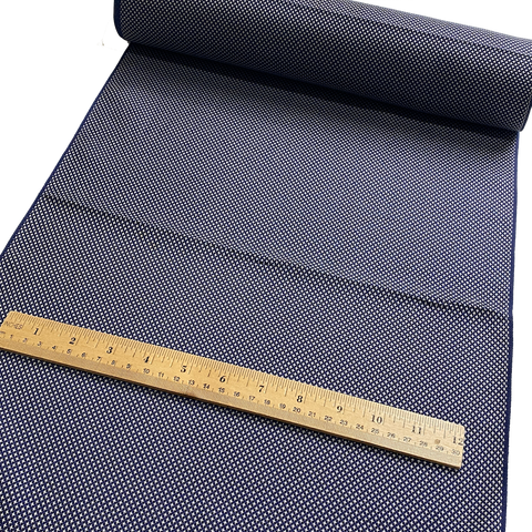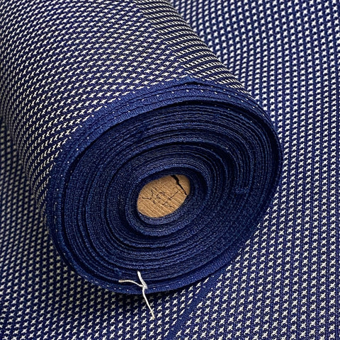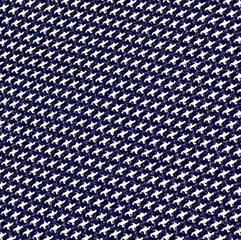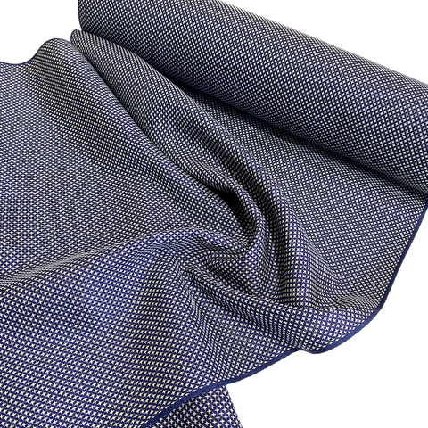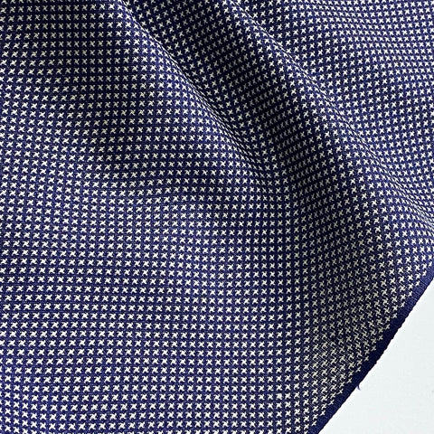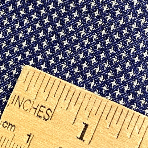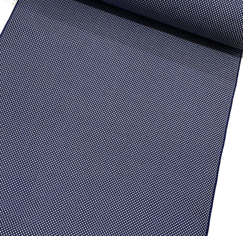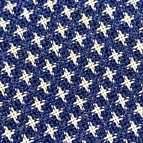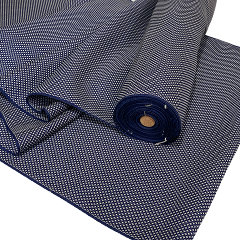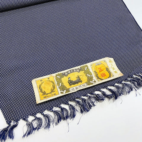 The weave is just navy and white, with thousands of tiny white symbols that may be four-petaled flowers, or flying cranes, or?? All done in the weave; it's a gorgeous kasuri ikat. This silk is thin, soft, mid-lightweight, supple, and a little drapey. It doesn't have sheen or body. Both sides look and feel the same. This is a vintage, never used silk. The bolt has been carefully stored for many decades and is in excellent condition. 14" wide, sold by the full yard. We'll cut yours in one continuous piece. The label reads Oshima Pure Silk, so it's most likely mud dyed and hand woven. Age unknown. 100% Silk. Japan.