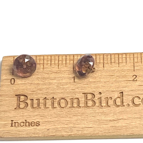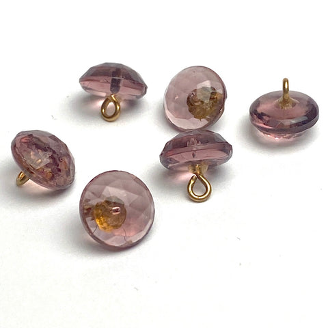 Antique glass, clear, faceted purpley brown buttons. 3/8" diameter and 3/8" long including the shank. Very sparkly, new old stock. We're selling therse discounted, As Is, just in case the shanks aren't totally stable, which can happen to metal and glue over time. They look fine but we've had it happen with some of our other similar ones. Possibly Europe 1920's-40's??