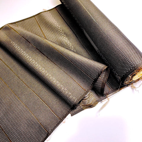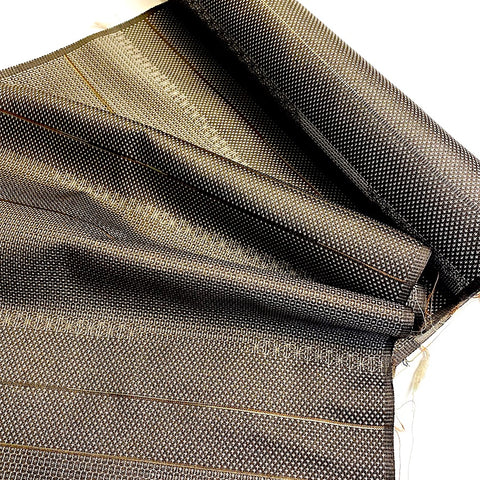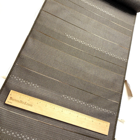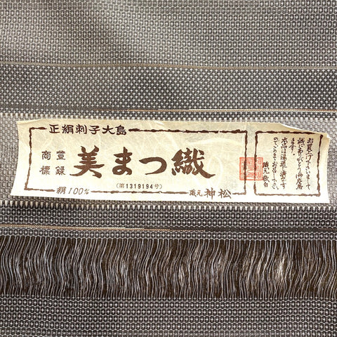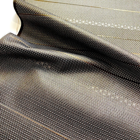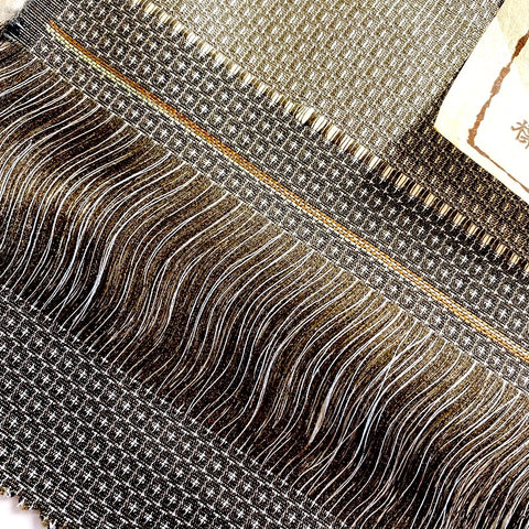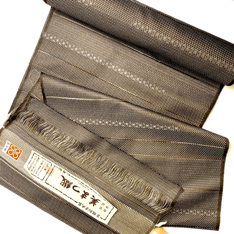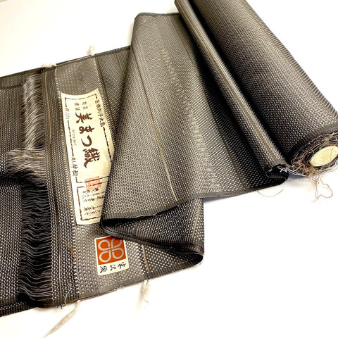 A still-tied bolt of rare, incredibly beautiful Tsumugi Silk Sashiko Oshima Matsutake. This is our first experience with a silk called Sashiko Oshima, which must be a reference to the ornate silk work in partial rows about every 5" to 7", that indeed does look like embroidery. How it was achieved, we're not sure, but this silk is one of the finest we've had. It should probably be in a museum and if no one buys it, we may have to create a museum for it :) The best of the best Oshima; supple, impossibly lustrous, finely woven with multiple complex techniques, in glowing bronze-brown-taupe that may take your breath away. So smooth and sleek, as Oshima is known for. 14" wide and most likely 12.3 yards, it's still tied closed. As you can see our photographer is in love and tried to extend the photo session. Our copywriter flirted with the words Religious Experience. 100% Silk. Japan. Exceptional.