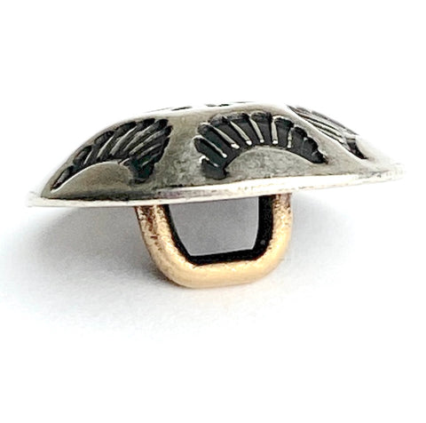 Southwest button with a slight dome shape, 13mm diameter, made from Nickel Silver. It's quite shiny. D-ring shank opening is about 3mm. USA. Sold per button.