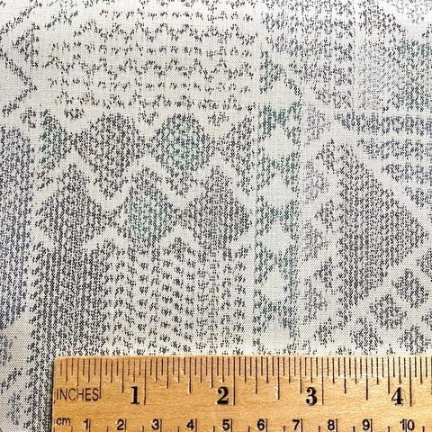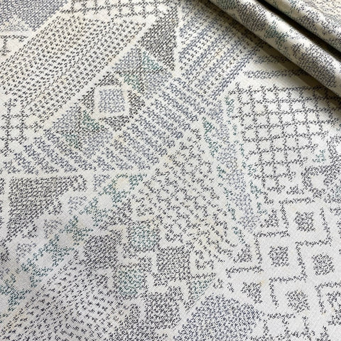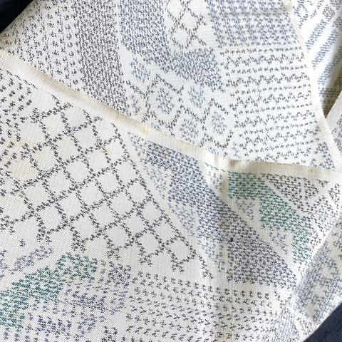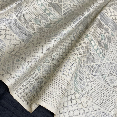 Perhaps the weaver was inspired by a sashiko sampler. This thin, light, amazing soft and supple vintage kimono silk is most likely from the Island of Oshima, Japan, famous for this type of silk, but there are no labels. The intricate details in the weave seem impossible. The kimono made from silks like this become beloved heirlooms in Japan because they are so beautiful, long-lasting and so comfortable to wear in all types of weather, year after year. Lightweight and thin, very smooth, each thread is pre-dyed to create the intricate ikat design once woven. It takes years to learn the technique, and months to dye and weave one bolt; there are so many processes necessary to assure its beauty. The background is creamy off-white, and the ikat colors are gray, black, blue-gray and green, all woven from very fine silk. A true ikat, both sides are the just the same and very soft and smooth. It has a bit of body, no shine and not much drape. This is vintage fabric, decades old, and there is some yellowing as you can see. 14" wide and sold by the full yard; we'll cut yours in one continuous piece from the bolt. 100% Silk from Japan.