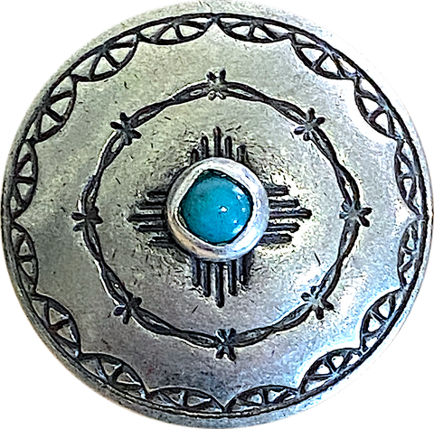Zia symbol nickel silver concho button with faux turquoise stone in the center. The circle in the middle of the rays ties the rays together to represent love and life to the Zia people. Dome shape, shank back with loop opening around 2mm. Medium shine. 1" diameter and a bit more than 1/4" deep including the shank. Sold per button, limited supply.